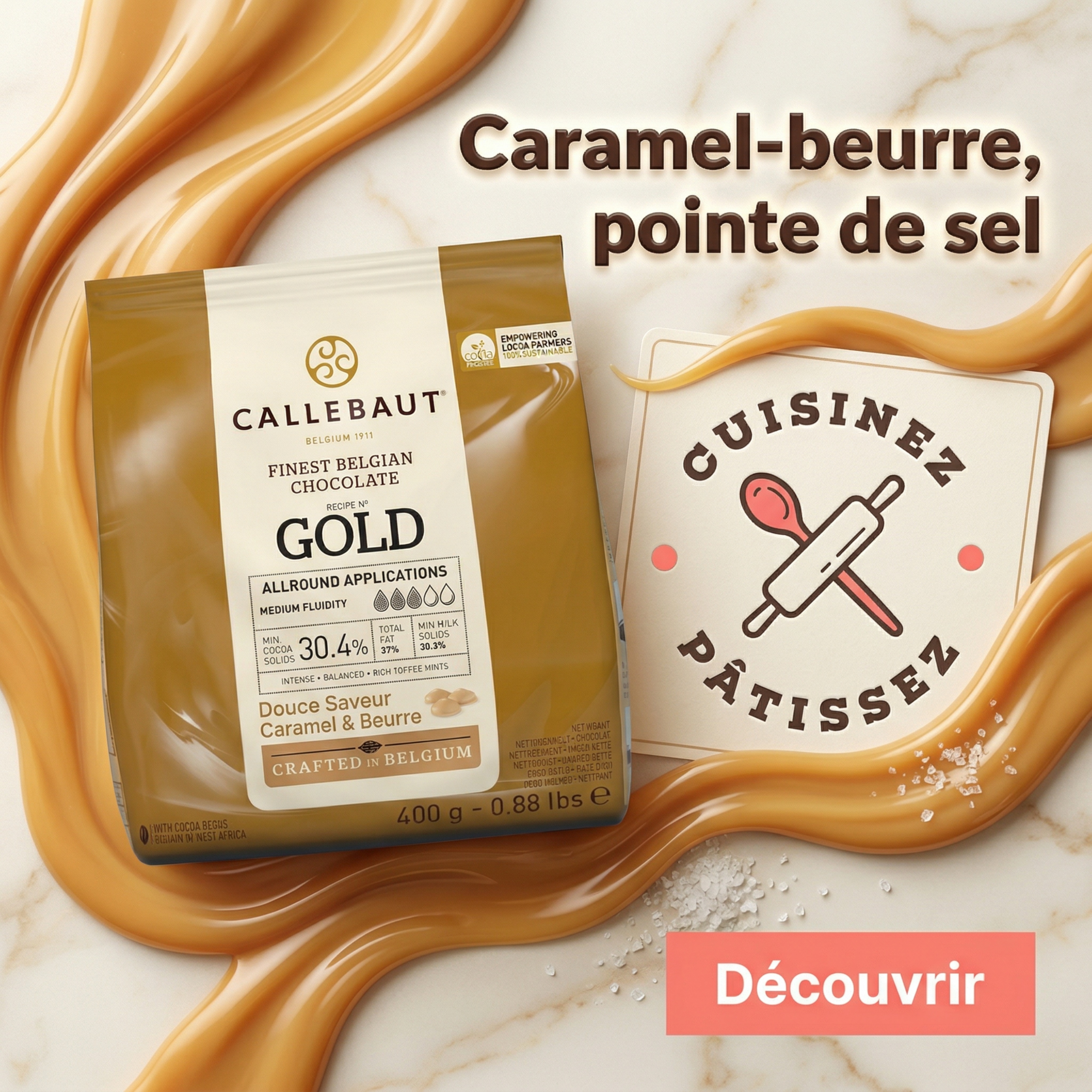 Chocolat Gold 30,4 % : l’intensité du caramel beurre salé pour des créations gourmandes