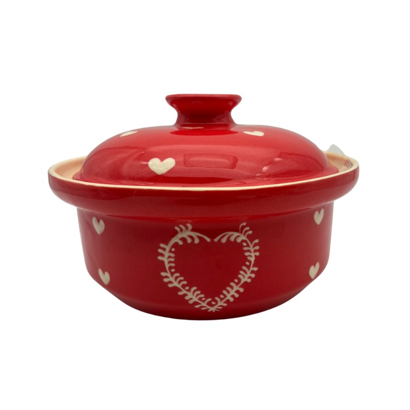 Apportez une touche d’amour à votre cuisine avec cette terrine ronde en terre cuite décorée de cœurs rouges. Son format pratique de 2 litres est idéal pour 2 à 3 personnes et convient aussi bien à un dîner en amoureux qu’à un repas en famille.