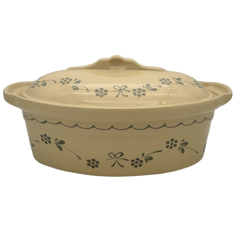 Cette grande terrine N°4 est conçue pour les tablées conviviales et les recettes généreuses de Baeckeoffe. Elle mesure 37 cm de long, 23 cm de large et 19 cm de haut, pour une contenance de 4 L et une hauteur intérieure de 12 cm. Parfaite pour 4 à 6 convives, elle combine tradition culinaire et esthétique artisanale, idéale pour les repas de fête ou les grandes occasions.